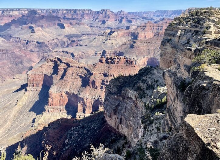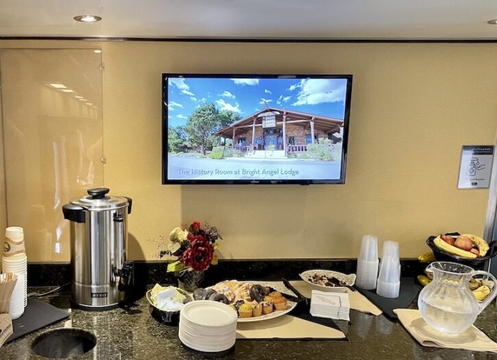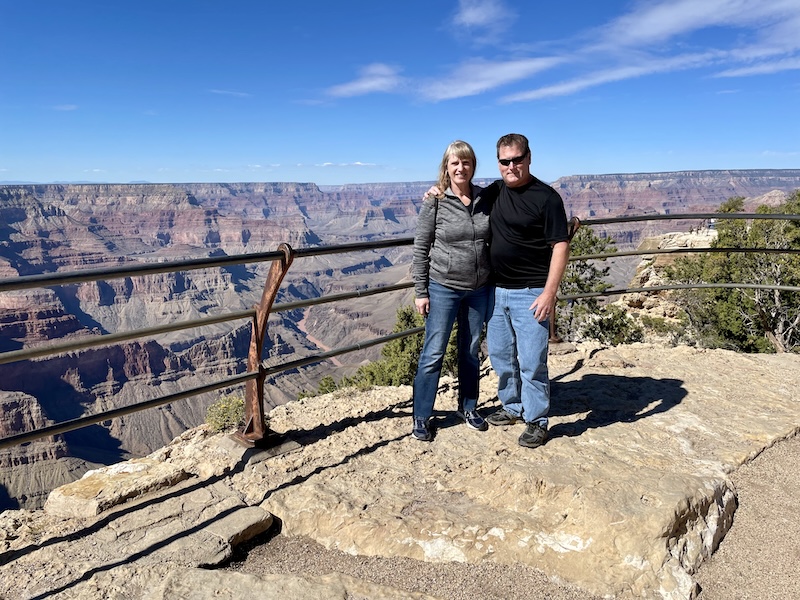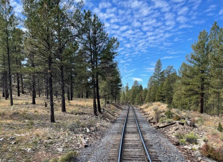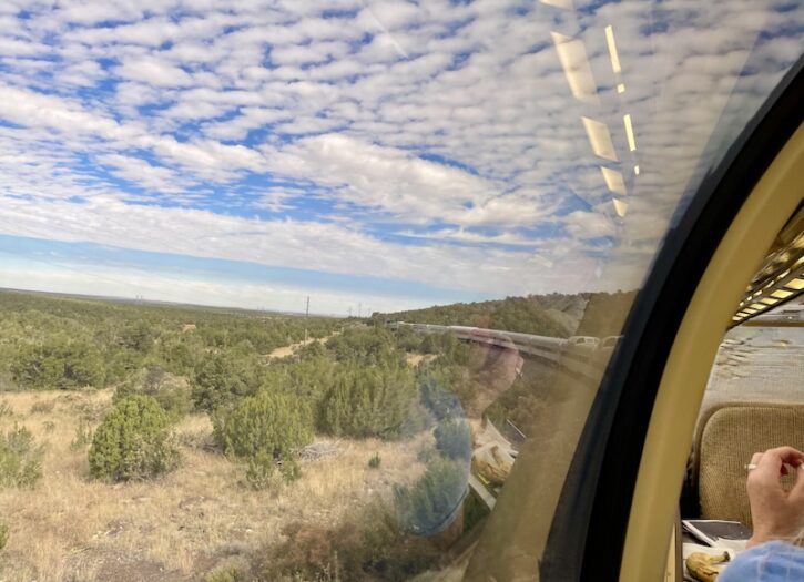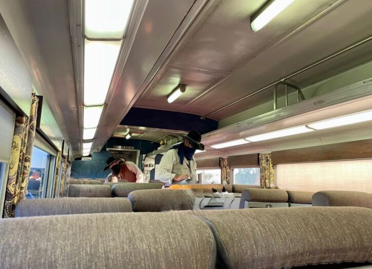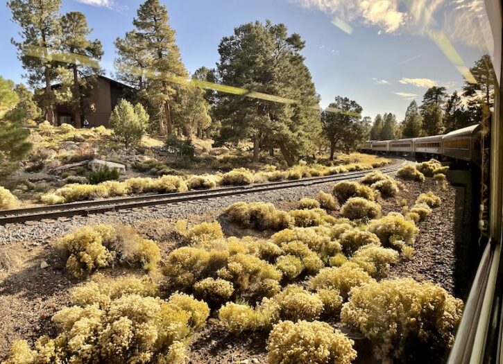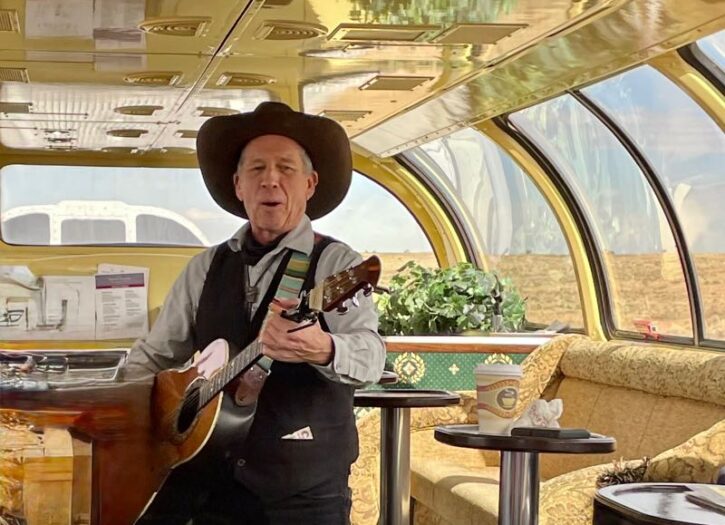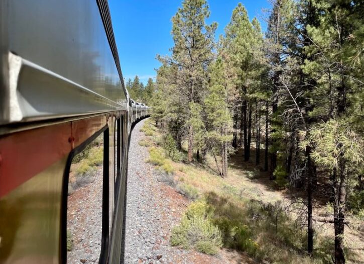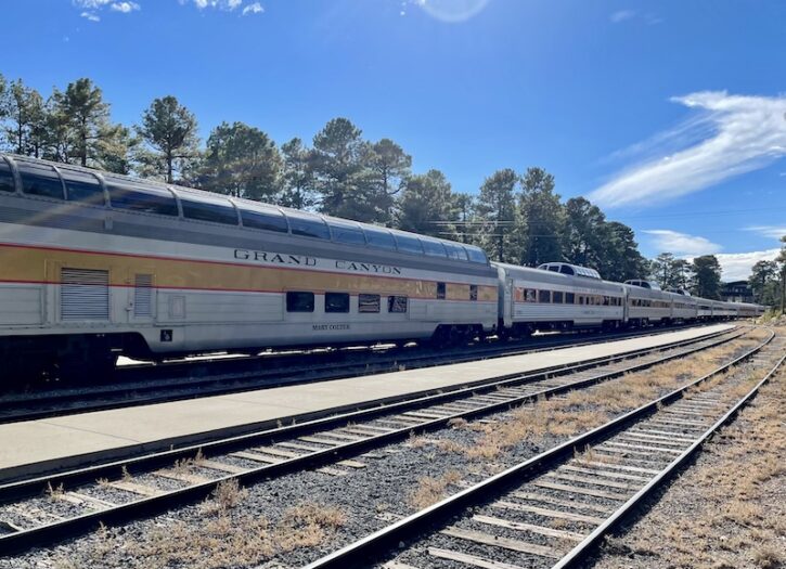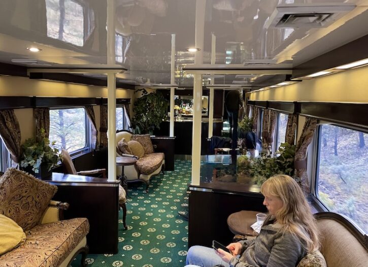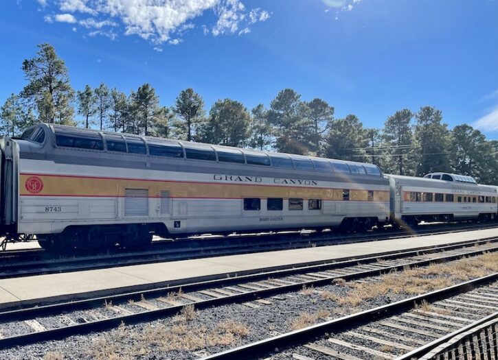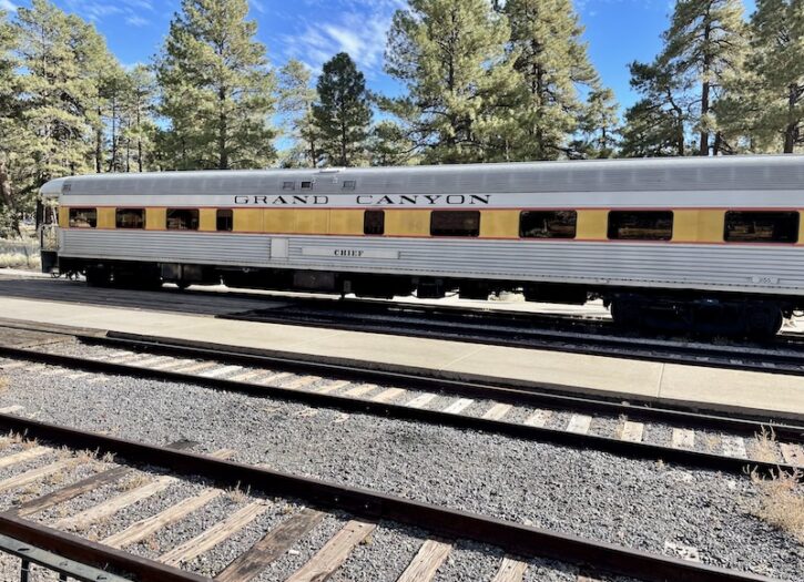 In the fall of 2022, my wife and I took a trip to Arizona. While there, we decided to visit the Grand Canyon by way of train. The Grand Canyon Railway provided an outstanding way to reach the canyon. Our visit started with a wild west gunfight in the town of Williams before preparing to board the train. We chose seating in the observation car on the way there but coach on the way back. This was a money-saving decision, and we didn’t feel like we missed anything on the way back. The observation car was clean, comfortable, and luxurious. Drinks and snacks were available to us and included with our ticket. There was also a singing cowboy who made his way through the train, providing live entertainment for all. We went down to the lounge area, which was directly below the observation area. The lounge was plush with period couches and a buffet of snacks, again included with our fare. We then walked back to the end of the train. There was no caboose, as you might expect, but the last car had an observation area on the back.